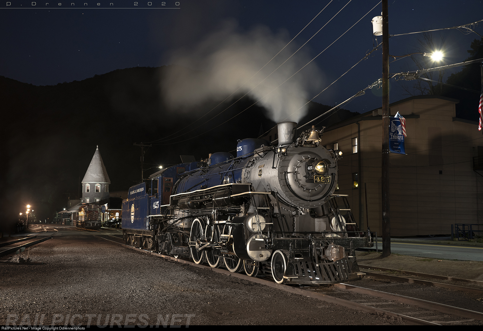 During a string of surprise excursions, Reading Blue Mountain and Northern 425 is found here resting in the quiet evening light of Jim Thorpe, With the station spire in the background. Reading and Northern has used the locomotive of a the course of a couple weekends for the Lehigh Gorge scenic railroad trains. One of Reading and Northerns newly painted Diesel units can be seen in the distance as well