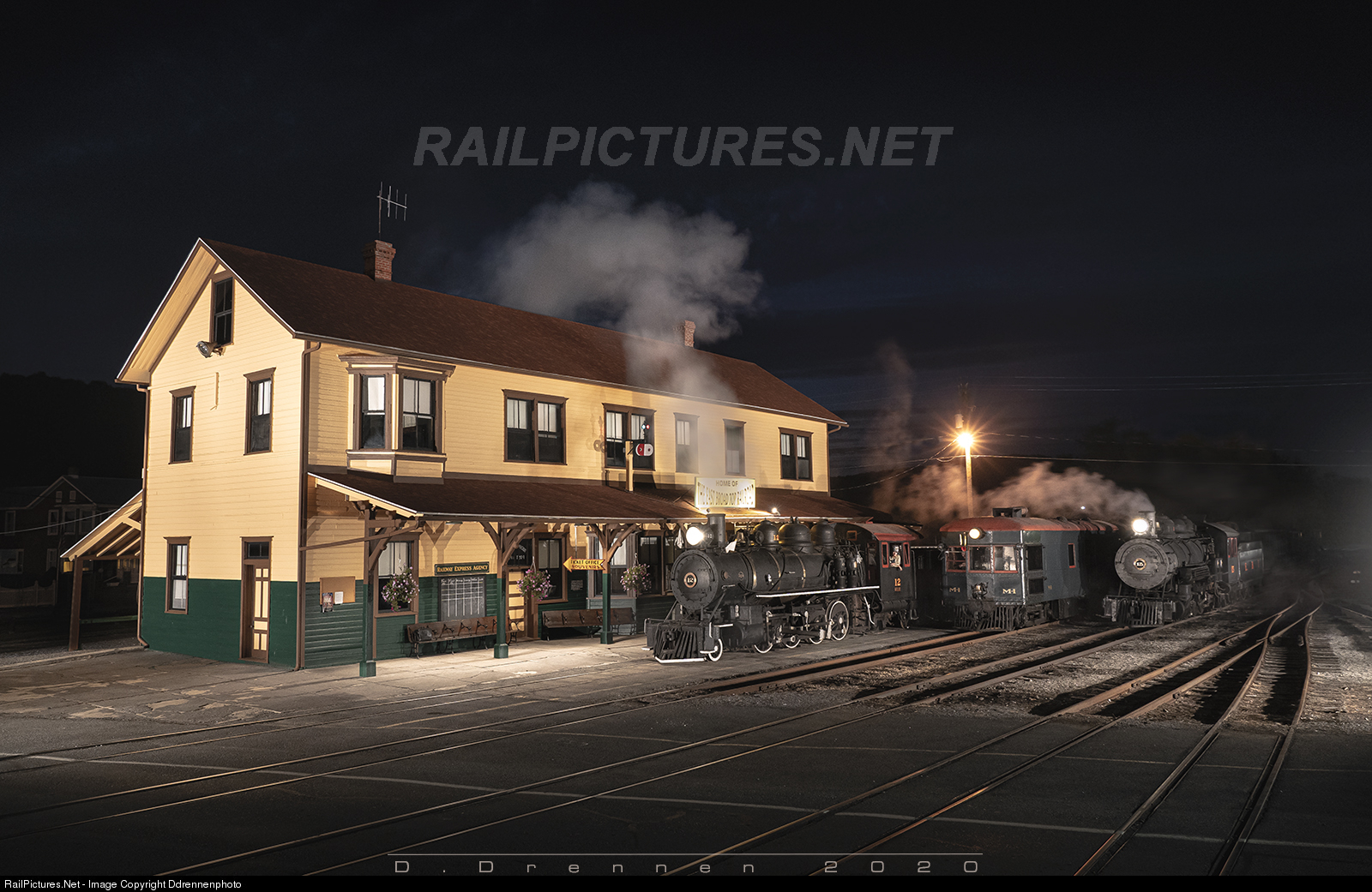 East Broad Top Locomotives 12 and 15 sit at Orbisonia Station as part of a night photoshoot at the railroad. While the locomotives aren't under steam, smoke bombs create what will hopefully be real life in the future.