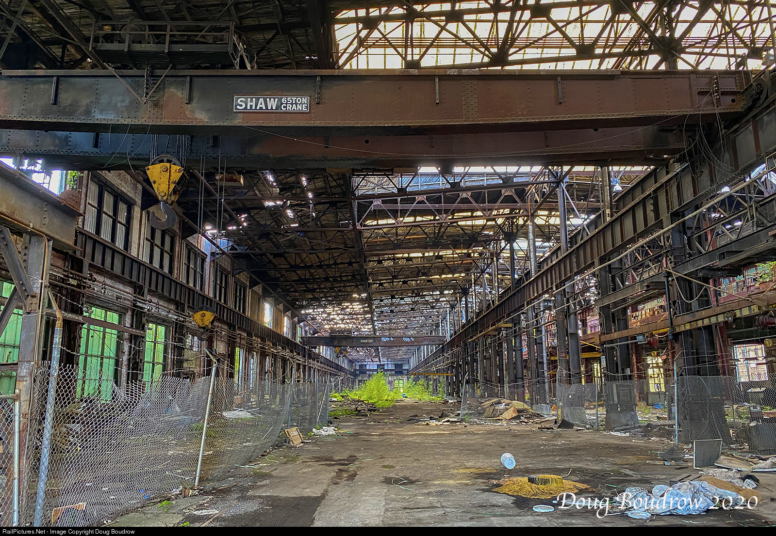 In what looks like a scene out of a post-apocalypse movie, the remains of the Boston & Maine engine repair facility at Iron Horse Park in North Billerica stand battered and weather-beaten after years of neglect. The complex was built in 1913 and served the B&M for many years doing heavy repairs on both steam and diesel locomotives as well as rolling stock. The future fate of the massive structure is unknown.