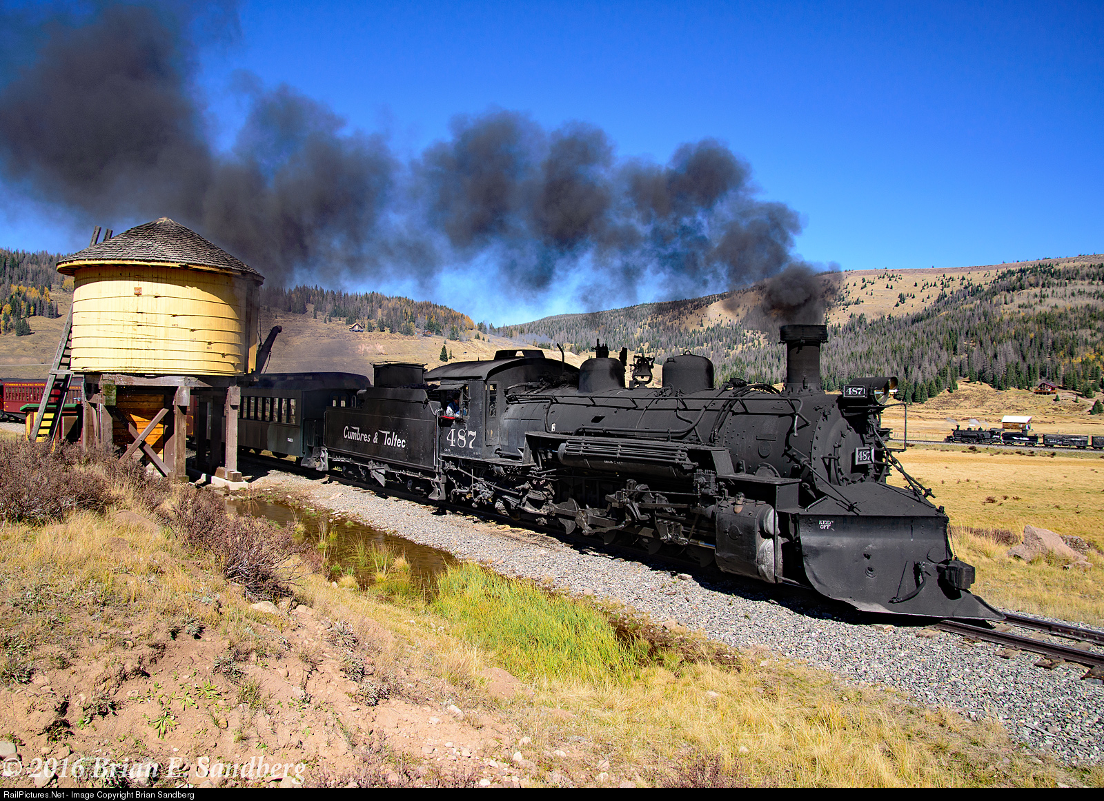 C&T K36 #487 and train bound for Chama, NM pass the Los Pinos Water Tank 10/5/16. D&RGW K36 #489 can be seen in the background, it held in the siding allowing the 487 to pass. This from day two of the 2016 Fall Photo Freight, organized by the Friends of the Cumbres and Toltec.