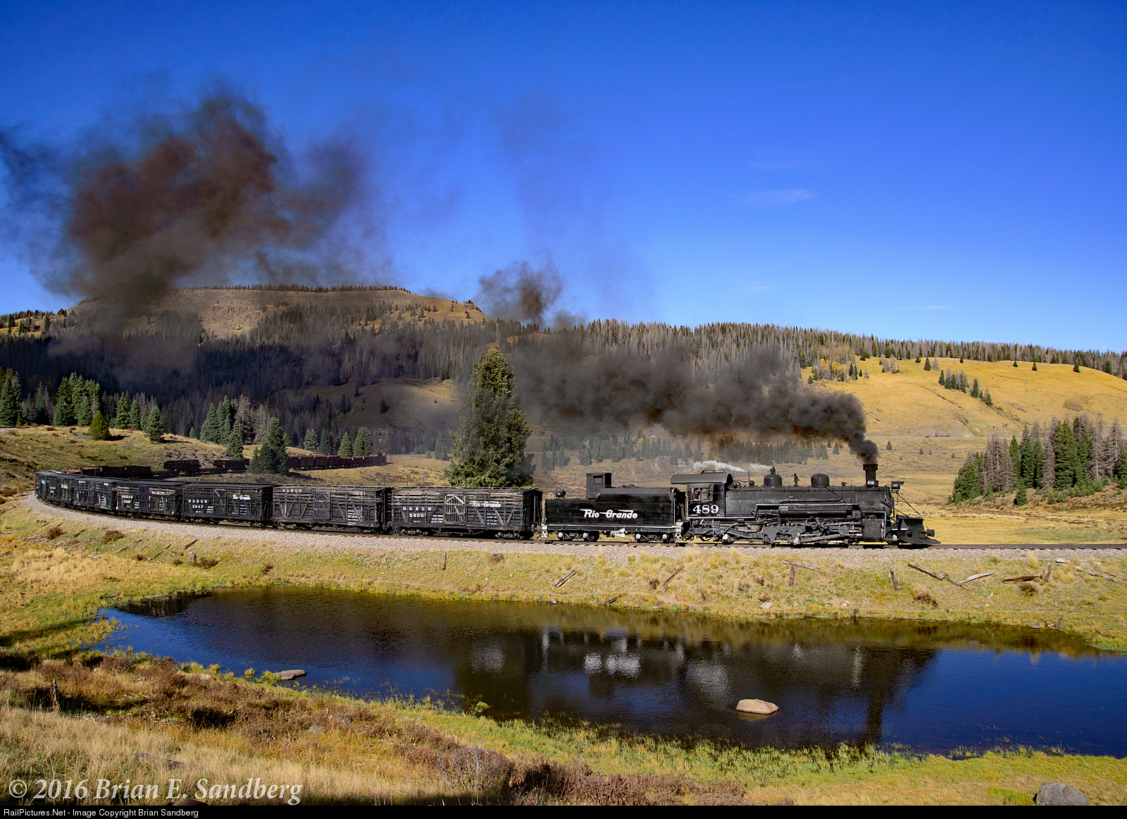 | D&RGW K36 #489 approaches Tanglefoot Curve on the return to Chama. This from day two of the 2016 Fall Photo Freight, organized by the Friends of the Cumbres and Toltec. |
