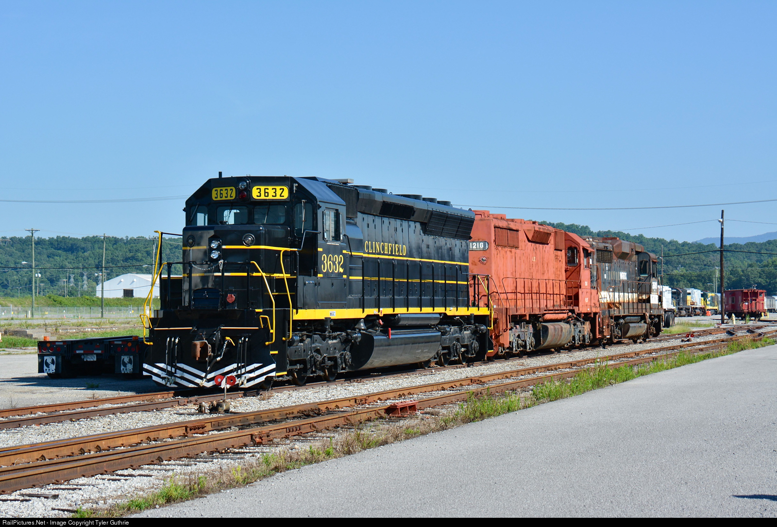 VLIX 3632 sits with some other locomotives on SARM property. 3632 is in a Clinchfield paint scheme. VLIX 1216 (second locomotive) is one of very few remaining L&N SD35's, and the last locomotive in the consist is an ex-Southern high hood GP30.