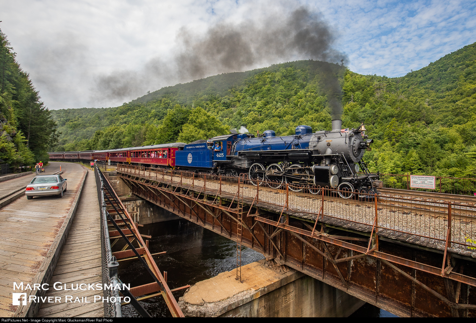 The Reading and Northern Railroad/Lehigh Gorge Scenic Railway 1100 departure was lead by 425 (Baldwin, 4-6-2). As it crossed the Lehigh River in Glen Onoko, Pennsylvania on Saturday, August 15, 2020, it was following the "new" route of the Central Railroad of New Jersey that is currently used by the Reading and Northern, as this bridge was built in 1913. To the left of the scene is the Turn Hole Tunnel. When it was built in 1866, it carried the main line of the predecessor Lehigh and Susquehanna River Rail Road until the building of this new bridge. The rails were removed in 1956, and today the tunnel is an attraction for hikers, part of Lehigh Gorge State Park.