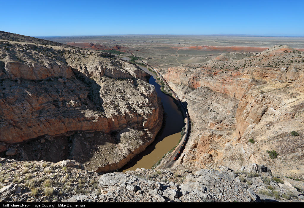 From the top of the rim overlooking Wyoming’s rugged Sheep Canyon is a view of BNSF’s Denver to Laurel freight following the Bighorn River northbound on the Casper Subdivision the morning of June 23, 2020.
