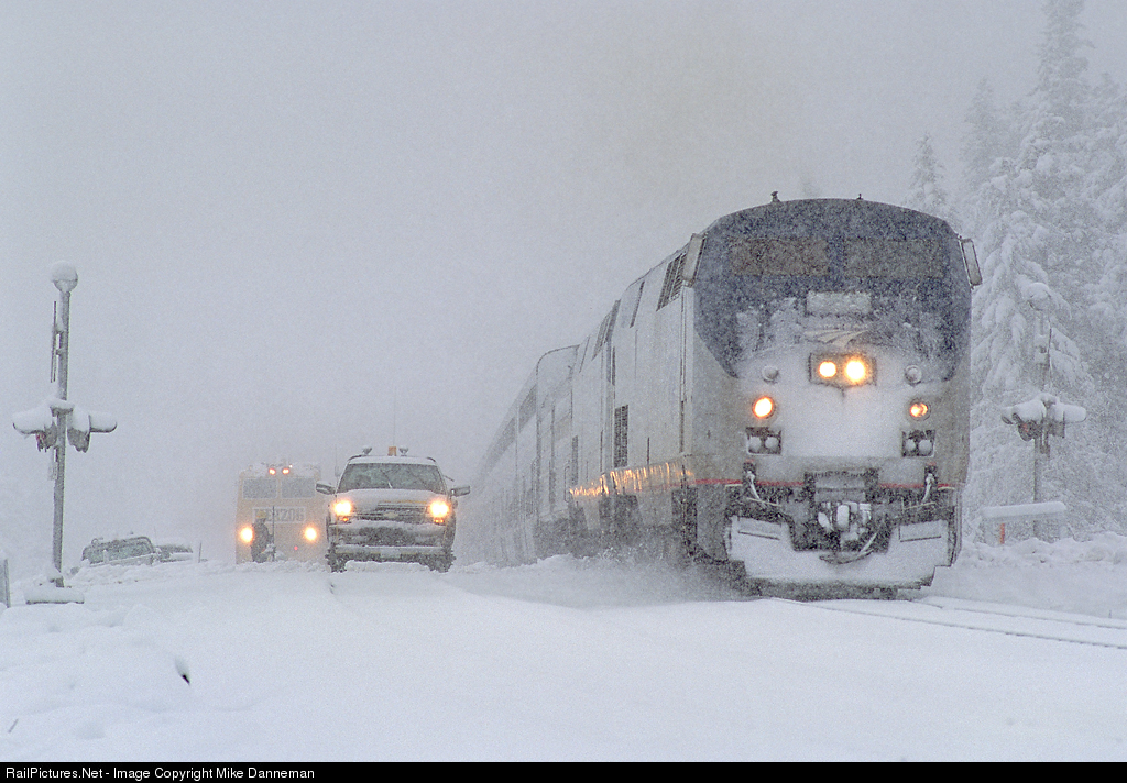 In a springtime snowstorm in the Colorado mountains, Amtrak’s westbound California Zephyr passes a hi-rail truck in the siding and a Herzog work train in the house track as it treads through the snow over Gross Dam Road grade crossing at Crescent on April 24, 2007.