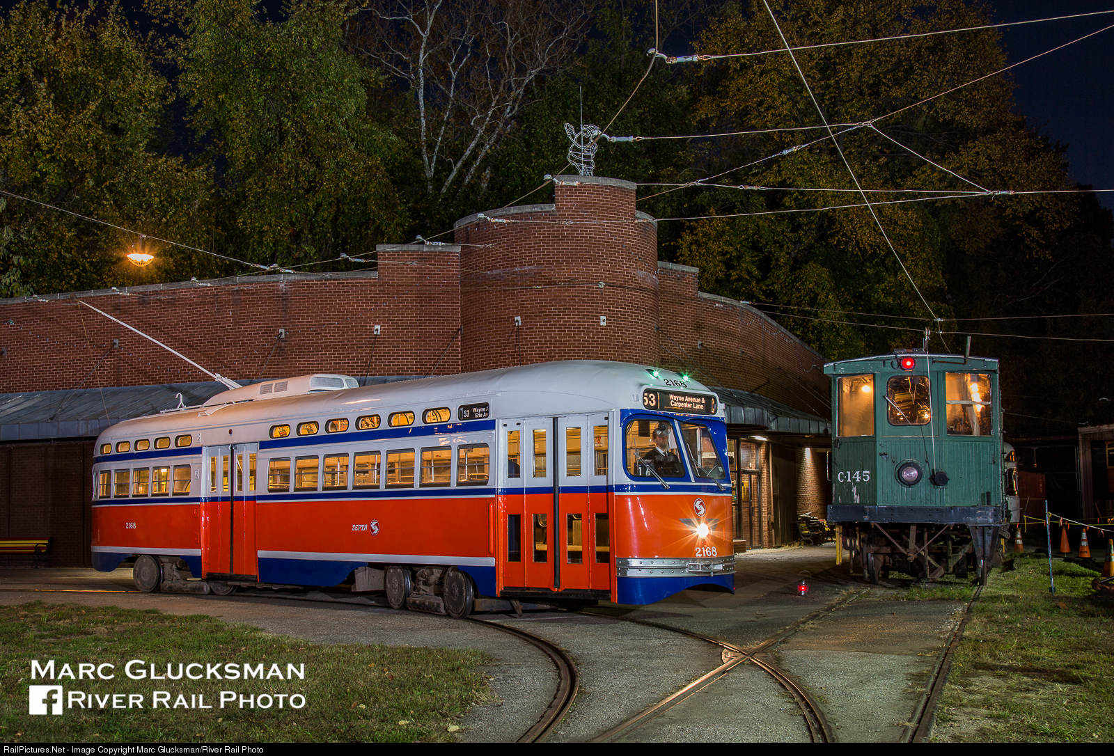 The out of towners. The collections of the Baltimore Streetcar Museum, Inc. is almost entirely comprised of cars that operated in Baltimore. Two exceptions include former Southeastern Pennsylvania Transportation Authority (SEPTA) PCC car 2168 (St. Louis Car Company, 1948) and snow sweeper C-145 (J.G. Brill Company, 1923). On the night of November 5, 2016, museum volunteers and Friends of Philadelphia Trolleys (FOPT) held a night photography session in conjunction with a FOPT guest operator day. Shortly after this, a major restoration of C-145 began and is now almost complete. More on the Baltimore Streetcar Museum: https://www.baltimorestreetcarmuseum.org More on Friends of Philadelphia Trolleys: http://friendsofphiladelphiatrolleys.org