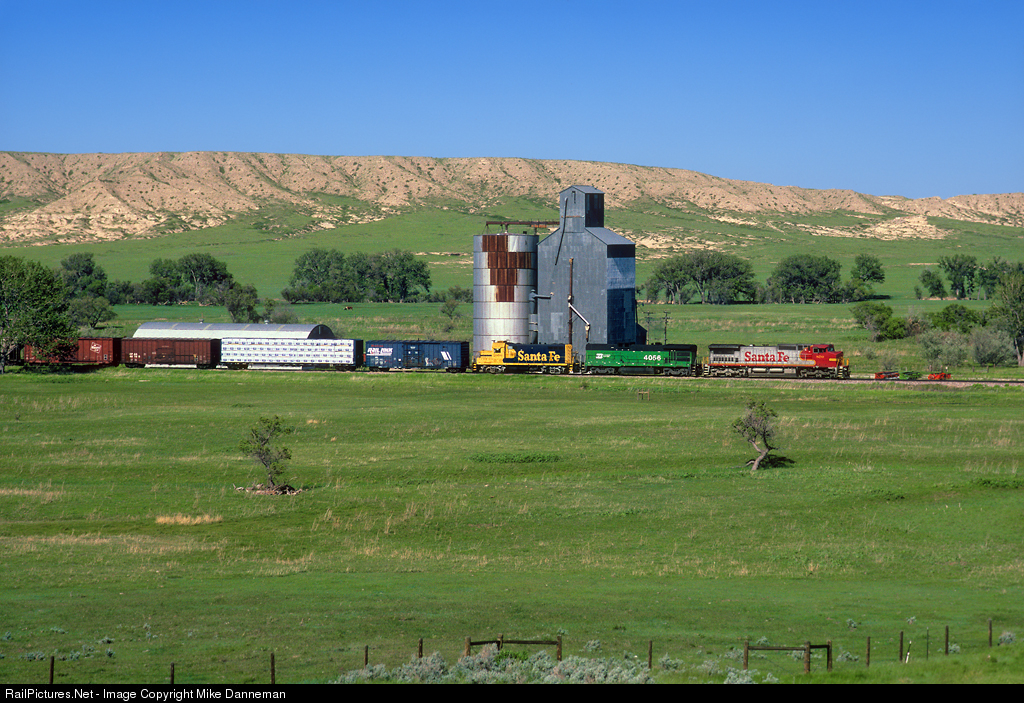Passing the vintage grain elevator at Slater, Wyoming, is a a southbound BNSF freight on May 30, 1998. The train is powered by a colorful locomotive consist, with Santa Fe GE C40-8W No. 870 leading Burlington Northern GE B30-7A No. 4056 and Santa Fe EMD GP7u No. 2096.