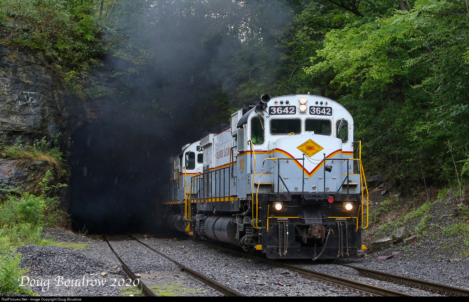 | The Delaware Lackawanna is seen emerging from Nay Aug Tunnel just outside Scranton. The train is bound for Pocono Summit with a large cut of loaded grain cars. The train has four locomotes on the head end with three pushers on the rear. |