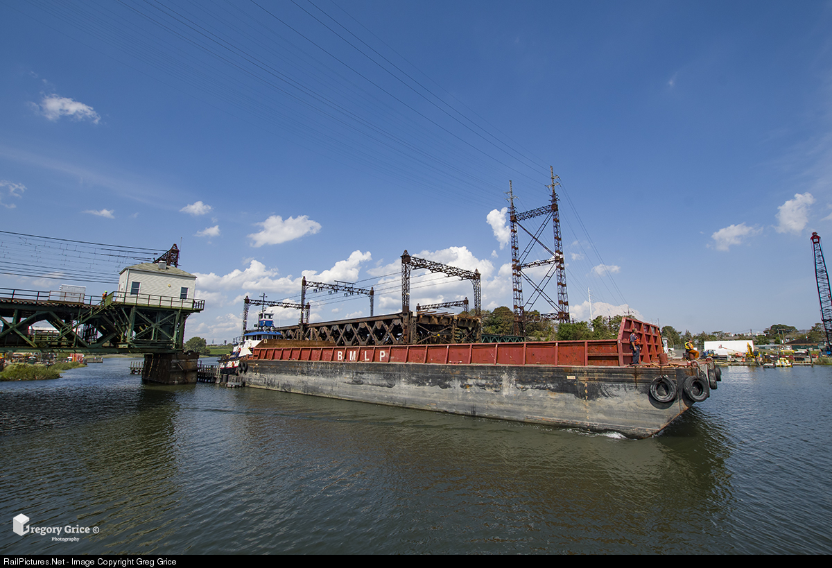The Buchanan 5 navigates an empty barge through Metro North Railroad's "WALK Bridge" in Norwalk, CT on a bright sunny evening. |