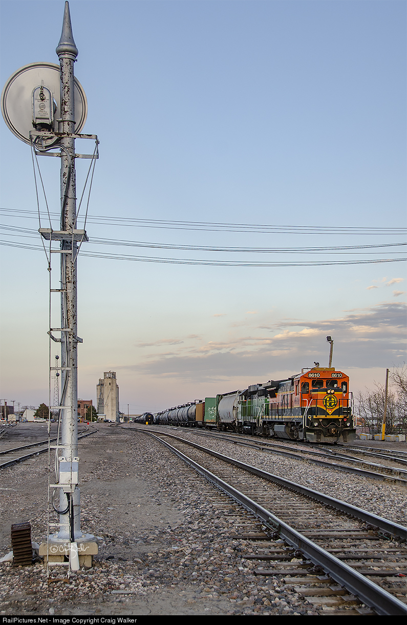 A westbound BNSF Railway manifest has arrived in McCook late in the afternoon after traveling on the Hastings Subdivision, and has tied down in the yard. McCook is the Division Point between the railway’s Nebraska Division (the Hastings Sub) and Colorado Division (the Akron Sub), as well as the point at which the railroad changes from Central Time to Mountain Time. The power on this train – BNSF Dash 8-40B 8610 (ex-ATSF 7420) and GP39-2R 2751 (ex-BN GP39E 2751, ex-NS GP30 2585, nee-SOU GP30 2585) – will be cut off and serviced, and will still be in McCook four days later. (McCook, Nebraska – May 8, 2013).