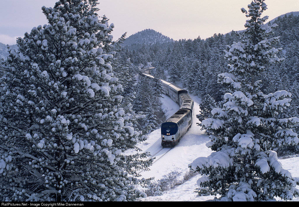 | Amtrak’s westbound California Zephyr winds its way through snow-covered evergreen trees at Crescent, Colorado, on the snowy morning of March 27, 2009. |