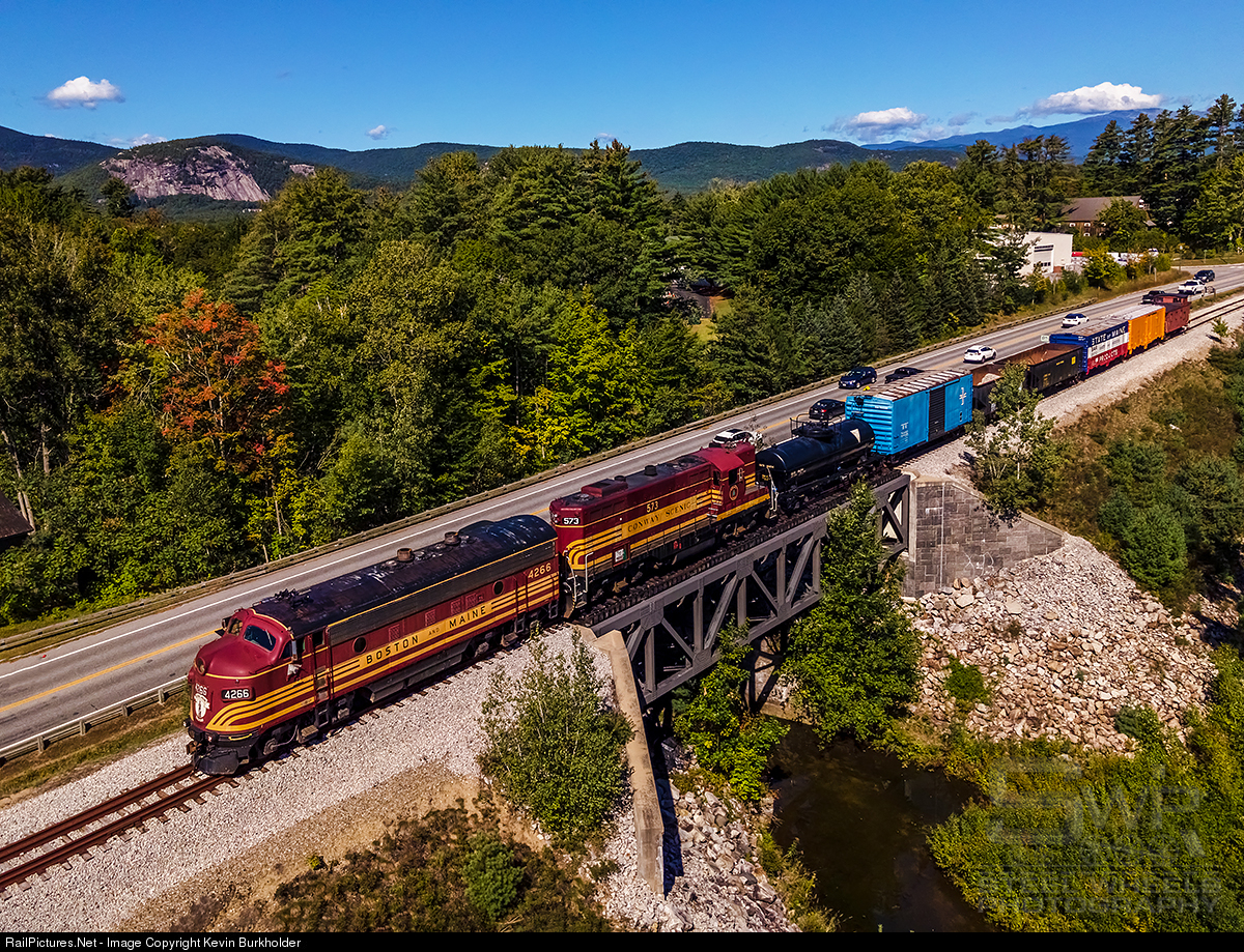 Extra local B&M 4266 heads south on the Redstone Branch enroute to service customers... Well, Conway Scenic photo freight is southbound on the former MEC Mountain Division turned Redstone Branch with the B&M-painted F7A 4266 and CSRX GP7 573.