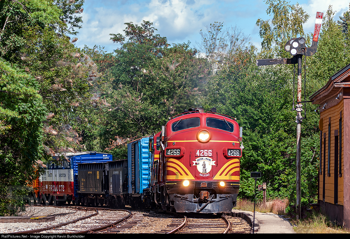 | Extra local B&M 4266 arrives at Conway, NH to receive its train orders to continue south, or not. The ditchlights are the giveaway as the Conway Scenic photo freight is southbound on the Conway Branch with the B&M-painted F7A 4266 and CSRX GP7 573. |