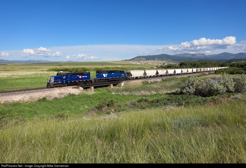 Montana Rail Link’s 840 local, the Helena local, has returned. The train operates out of Helena on weekdays and serves the cement plants at Montana City and Townsend. On June 25, 2020, MRL GP9 No. 109 and SD40-2XR No. 263 pass a trackside pond with a long string of two-bay covered hoppers from the cement plant at Montana City as the bring the Helena local back to the main line at East Helena. This five mile spur to Montana City is a remnant of Great Northern’s Helena to Butte line that survives under MRL ownership.