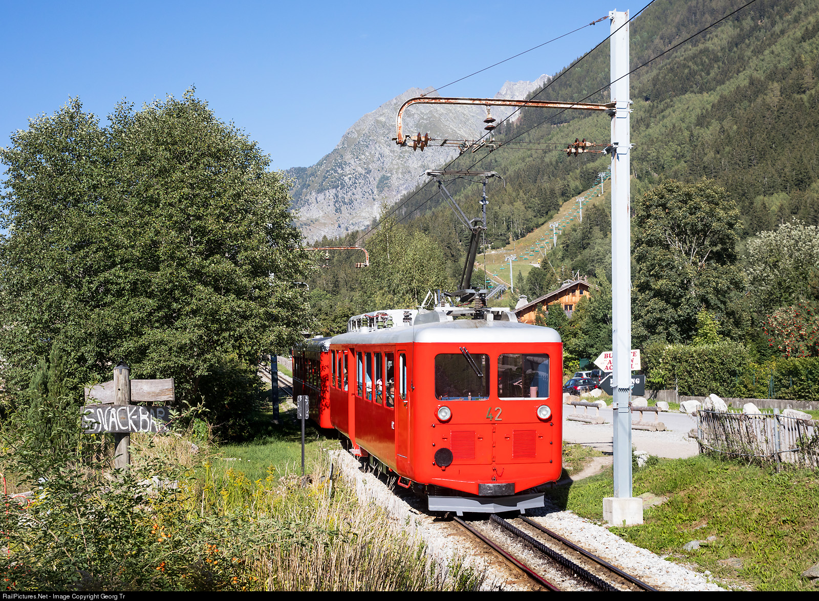 Cogwheel train of the Chemin de fer du Montenvers (Montenvers railway) with railcar Bhe 4/4 # 42 and cab car Bt # 52 is entering Chamonix-Mont Blanc station, coming down from Montenvers. The vehicles were built by SLM and MFO in 1954, but assembled by Decauville in Corbeil-Essonnes/France. Power comes from the overhead wire with 11000 V 50 Hz AC.