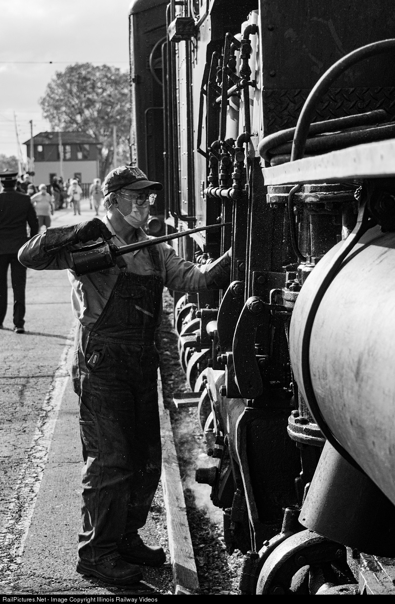 | Railroading in 2020. Labor Day Weekend marked the first event the Illinois Railway Museum held due to COVID-19. As the sun begins to set, one of the steam crew volunteers applies some fresh oil to some of the various moving parts on J, Niles Lumber Co. #5 while wearing a mask. |