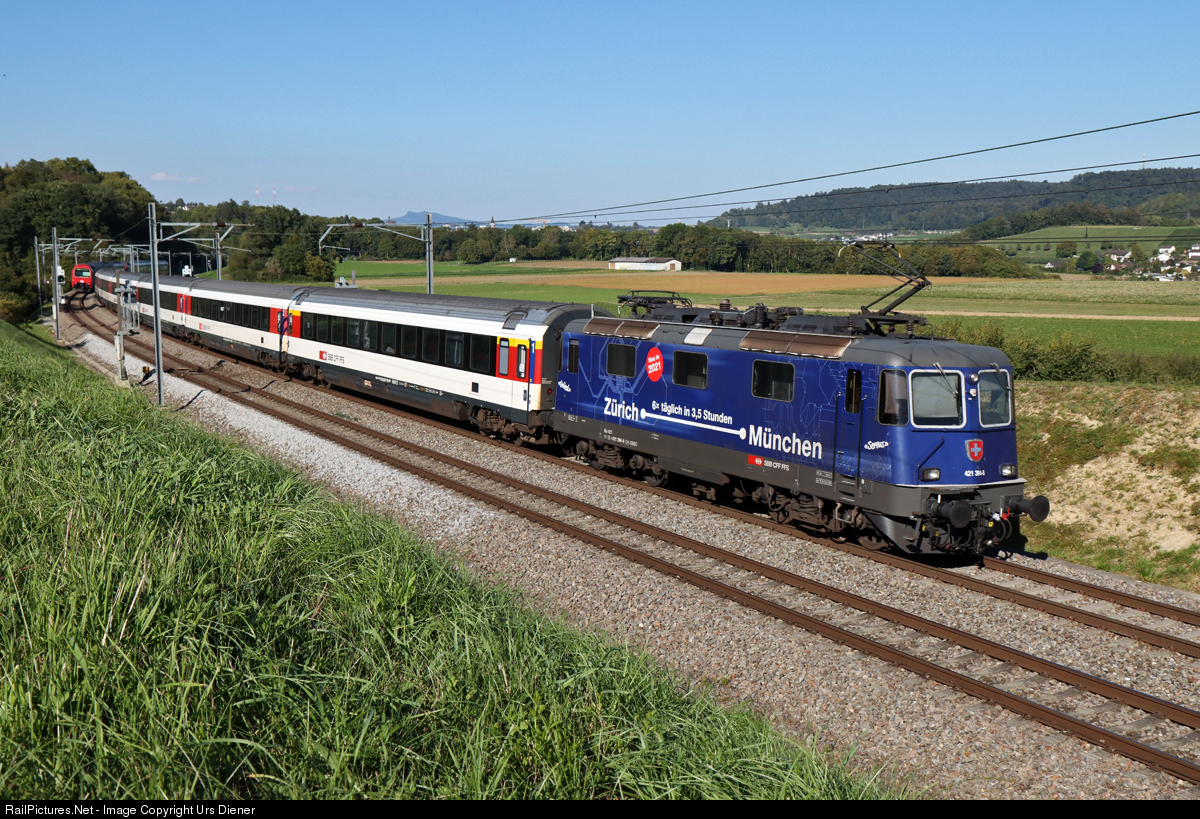 | The SBB locomotive Re 421 394, with the publicity paint scheme for the connection Zürich-München, is leading IC 189 to Zürich HB. |