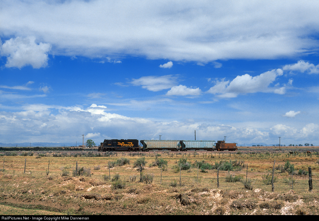The great expanse of the San Luis Valley surrounds a tiny Rio Grande local freight headed from Alamosa to Antonito at Estrella, Colorado, on the morning of May 24, 1991. Even though it doesn’t look like it in this view, irrigated agriculture and ranching abounds in this valley that is the headwaters of the Rio Grande River in south central Colorado.