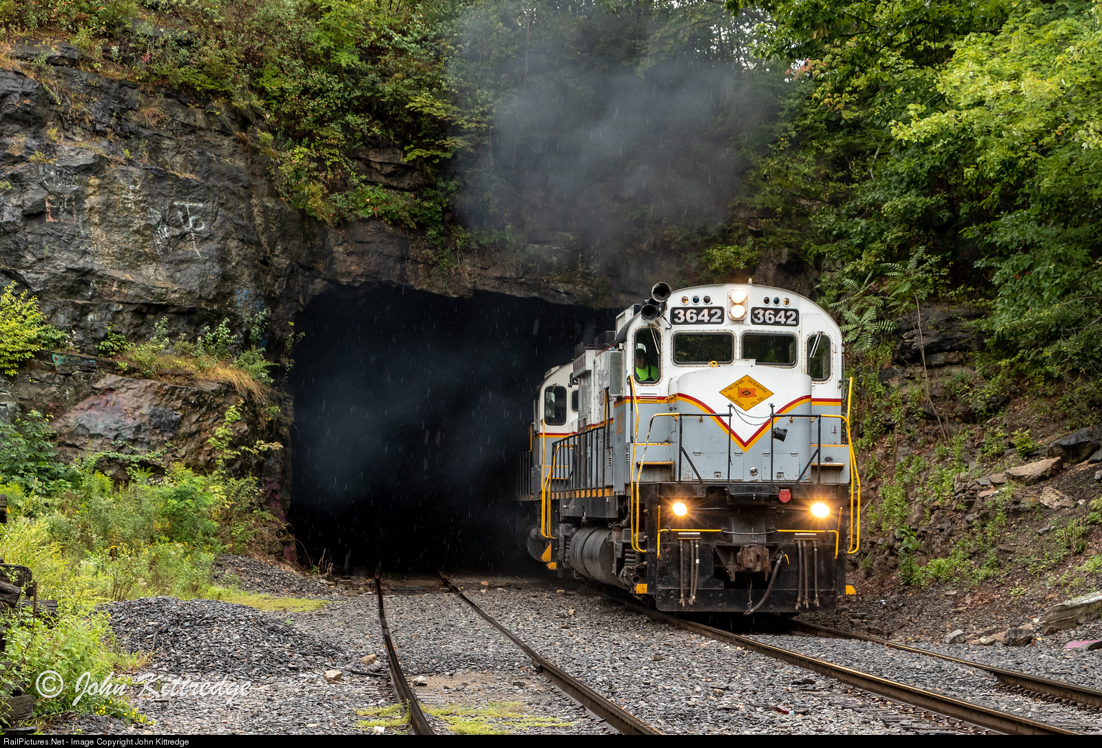 | Delaware Lackawanna C636 3642 leads train PO-74 out of Nay Aug Tunnel in Scranton on its way to Mountain Pocono and Cresco. The crew put on quite a show climbing the mountain with a heavy train in tow. |