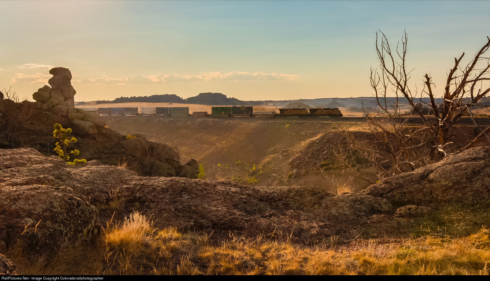Near Dale Junction a certain western magic lives in harmony with nature and the Transcontinental Railroad. A place of legends and mythos, a beautiful place. In this frame an eastbound Z hustles over the fill west of Dale Junction on Main 2. The late evening sun fills the valley and explains in detail what Sherman Hill is all about.