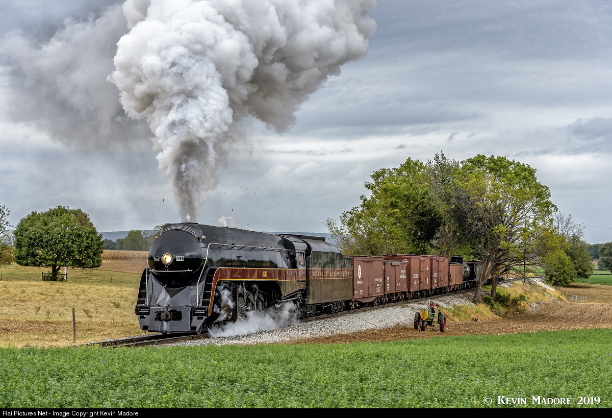 Highball at Carpenters. With leaves and other tree debris still flying off of her, Norfolk & Western Locomotive #611 emerges from the tree tunnel just east of Carpenters, making track speed with a vintage freight consist bound for Strasburg, PA. During her 2019 visit to Pennsylvania's Strasburg Rail Road, the 611 spent 3 days performing in photo events for rail photographers. These events were organized by the Strasburg and the 611's owners, the Virginia Museum of Transportation. The photo shoots featured both the 611 and the other extant N&W steamer, Strasburg's own M-Class #475. The shoots were directed by veteran charter organizer Pete Lerro, who did an awesome job of "herding the cats" and ensuring that everyone got great photos while staying safe. Although most of the participants would probably have preferred to see the 611 doing 60 mph on the NS mainline, the venerable Strasburg Rail Road proved to be the next best thing, with wide-open venues, nicely maintained track, and pretty Pennsylvania Dutch scenery.