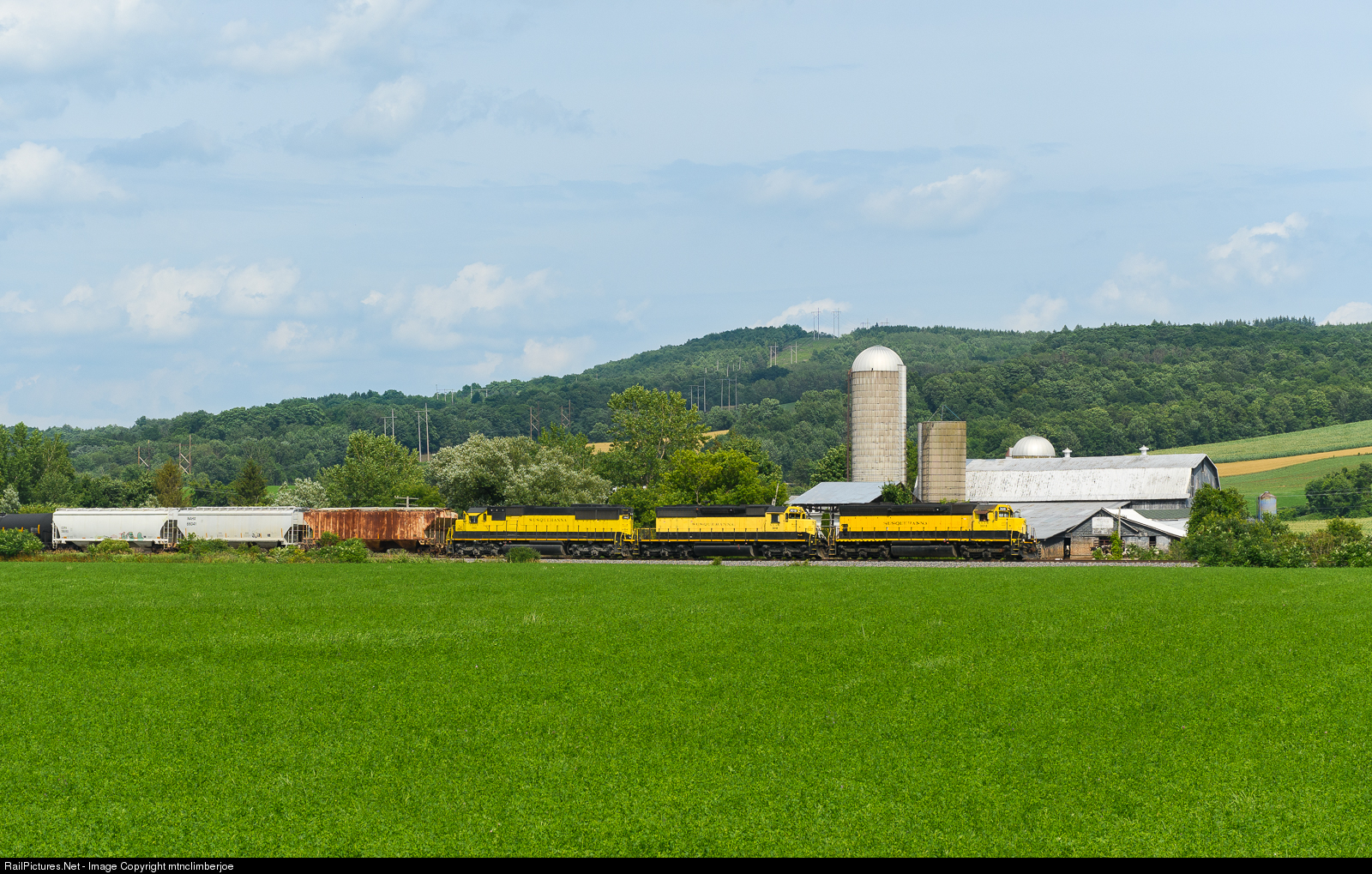 After stopping to work the Tully Ag Center, the New York, Susquehanna & Western CL-1 is on the move south out of Tully, New York. A trio of EMD's power the train through a rural landscape that is dotted with farms.