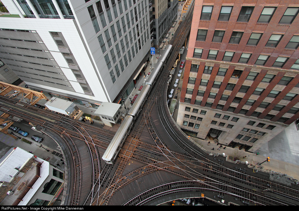 A Chicago Transit Authority train passes CTA Tower 18 as it crosses the diamonds on the elevated route over Wells Street in Chicago, Illinois, on November 8, 2018. This railroad interlocking located above the intersection of Lake and Wells Street is reportedly the busiest in the world.