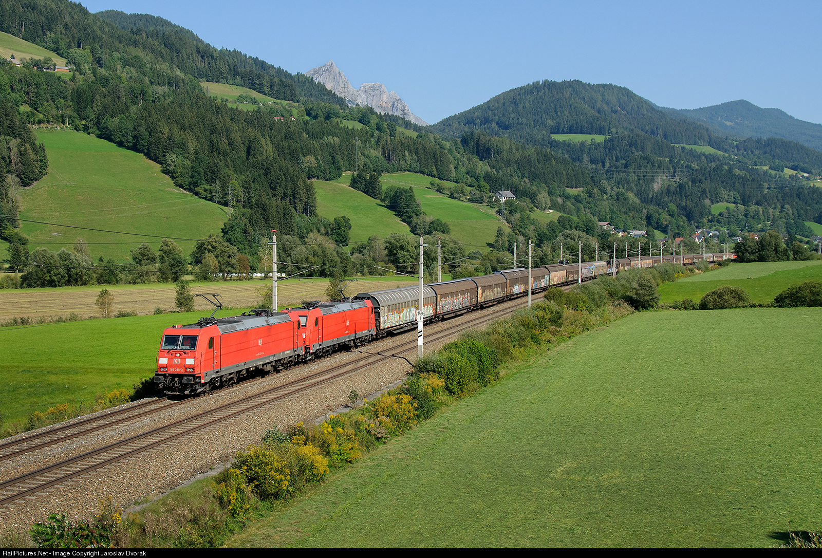 | The locomotives TRAXX 185 238-3 and TRAXX 185 272-2 at the head of a freight train bound for Admont. At the end of the train, the locomotive ÖBB 1142 626-1. |