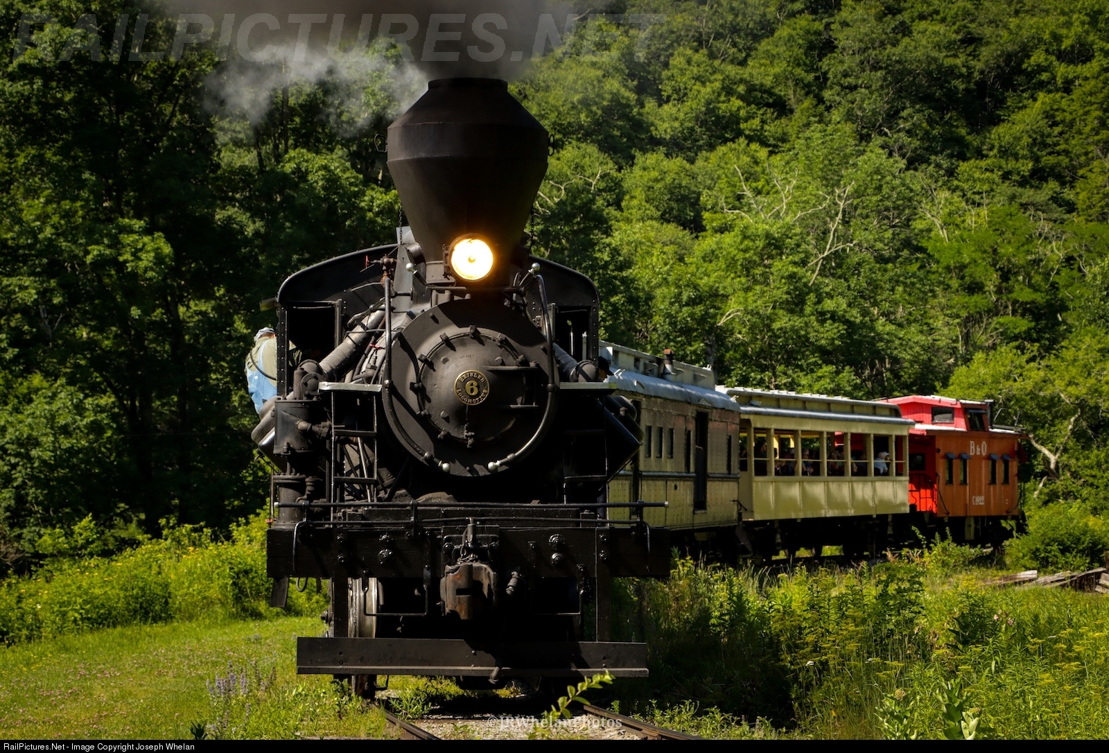 On a beautiful summer morning, Engineer Ross Harrison guides Cass Scenic Railroad Heisler 6 through the remote village of Nottingham, which is along the old C&O Durbin Line.