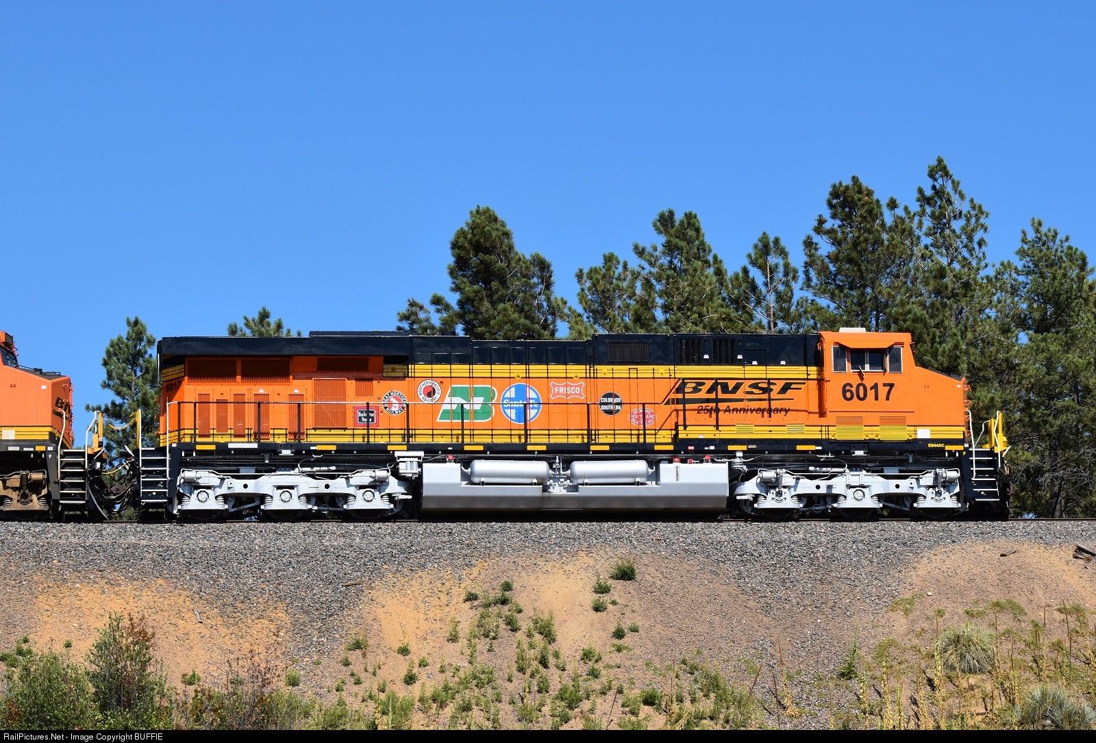 The decals on this 25th anniversary edition BNSF 6017 (ES44AC) acknowledge the lineage of the Burlington Northern and Santa Fe Railroad.