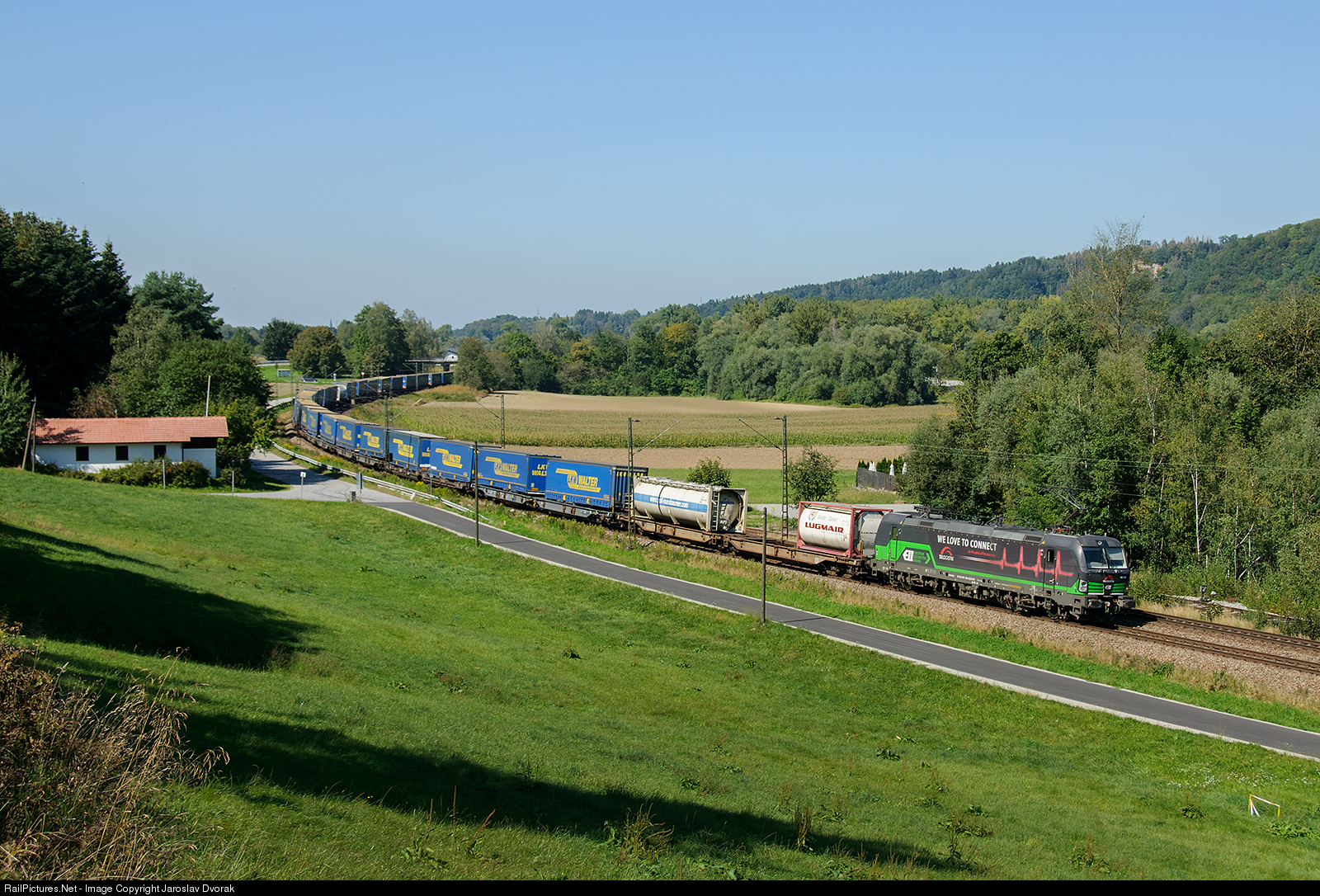 | The LKW WALTER container train, led by the VECTRON 193 265-6 locomotive, passes through the town of Vilshofen an der Donau |