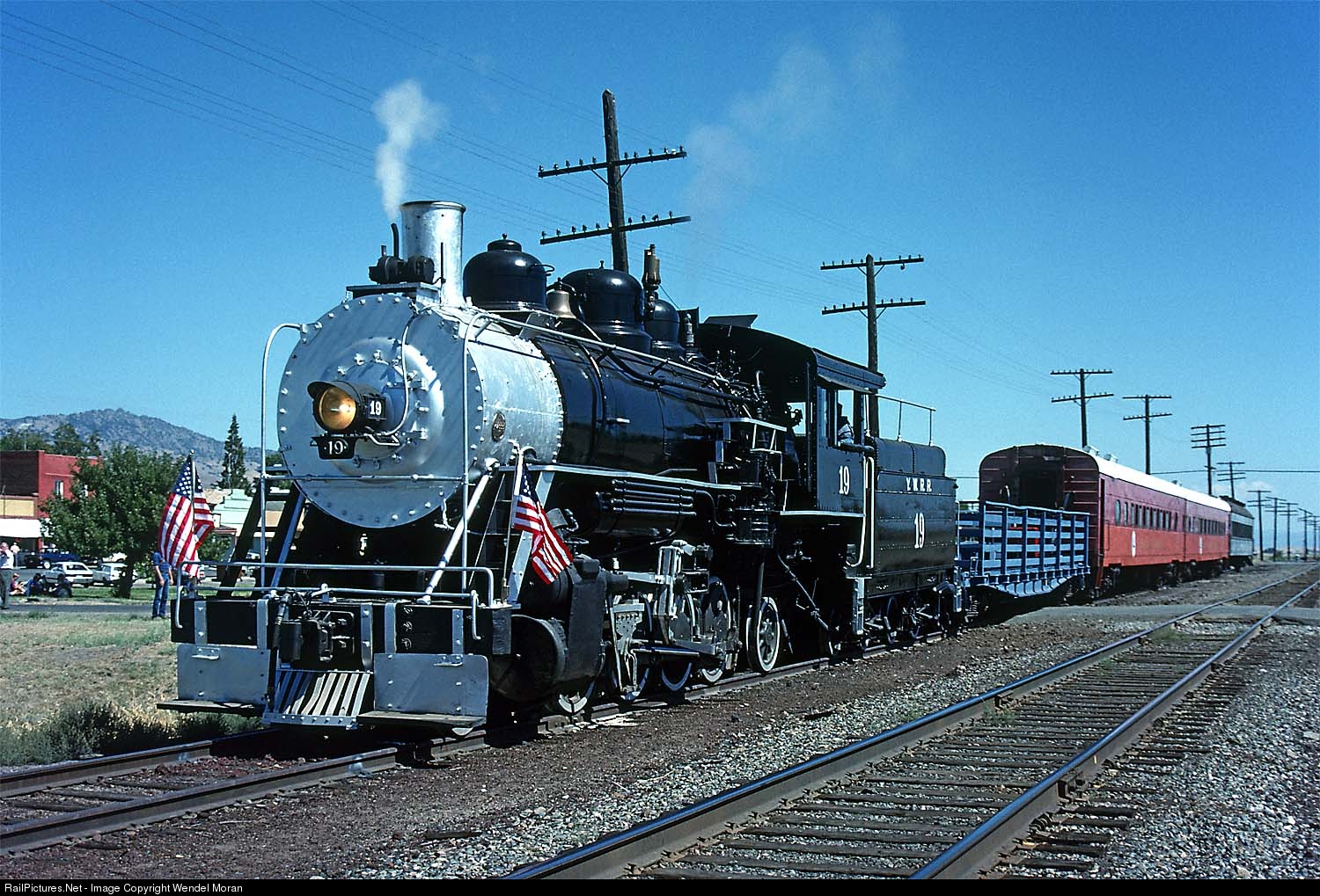 Shortly after the Yreka Western activated steam locomotive 19, it poses in Montague with the Blue Goose excursion train. The steamer had been relocated to Yreka from Oregon, Pacific & Eastern at Cottage Grove, Oregon the previous year.