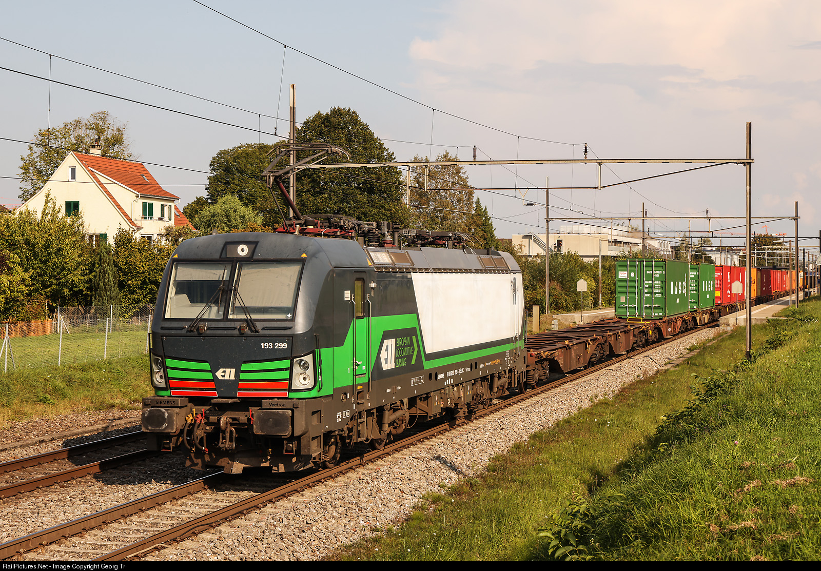 | Siemens Vectron 193 # 299 of the ELL, rented to the austrian Logistic and Transport Europe (LTE) and running for the EDG (Eisenbahndienstleistrer Gmbh) in Switzerland, is pulling the container train 40210 of Rail Cargo Austria from Wolfurt/Austria via St.Margrethen-Romanshorn VL-Winterthur-Kloten-Regensdorf-Bözberg-Basel to Rotterdam, through Amriswil. |