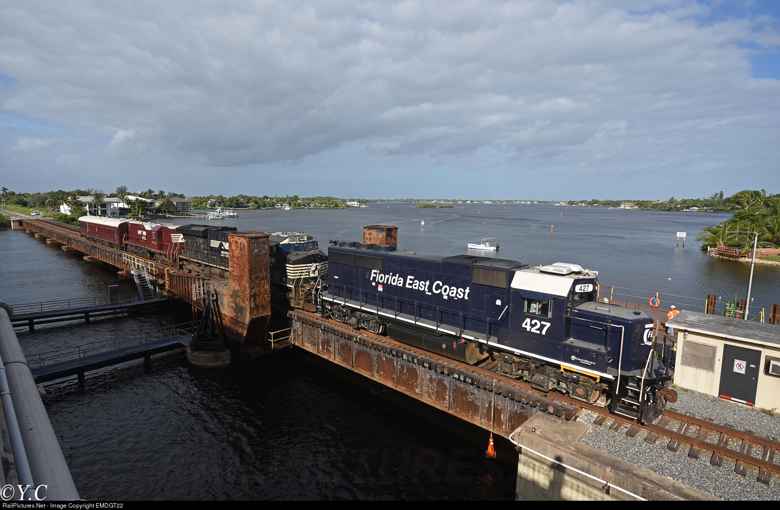 The Norfolk Southern Geometry train crosses the Loxahatchee River on its way back to Jacksonville. Workers are building a second drawbridge here to accomodate future Brightline service.