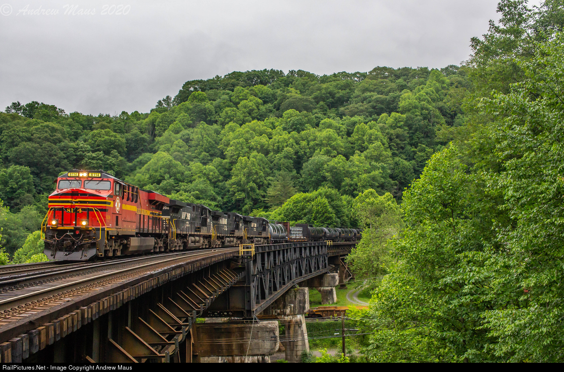| I ended up chasing NS 19M from Roanoke, VA all the way out to the trestle at Coopers with the guidance of Michael Walton and Daniel Alls. This train had one of the friendliest crews I have ever experienced, giving us a horn salute at every spot we stopped to shoot it. Seen here crossing the famed Coopers Trestle in Bramwell, WV after a crew change in Bluefield. |