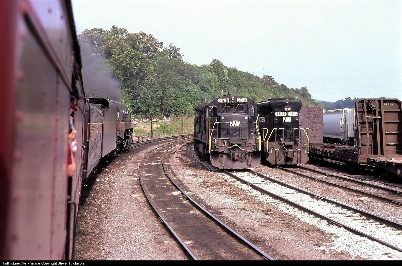| View from the vestibule. Returning from an afternoon turn to Walton, VA, N&W 611 and train pass the west end of Roanoke yard. Waiting to go west are N&W C36-7 8518 and SD45 1811. Standing in the vestibule on mainline excursion trains was great fun! |