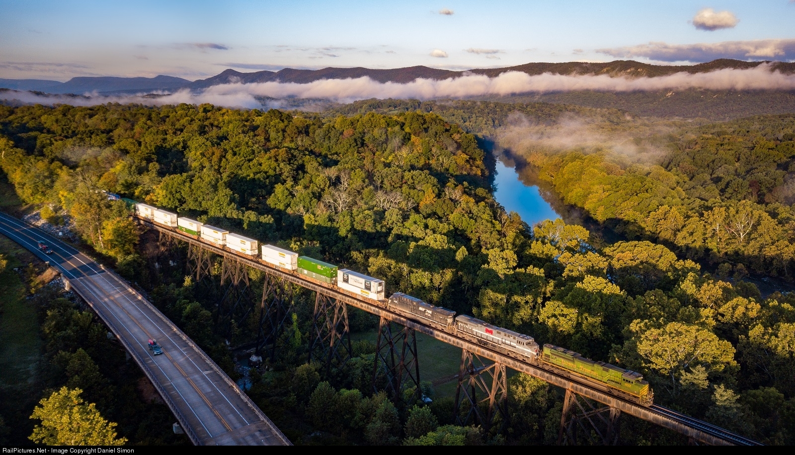 Norfolk Southern train 202 (Rossville, TN-Rutherford, PA intermodal) with two heritage units flies over the Compton Trestle on the Norfolk Southern Hagerstown District.