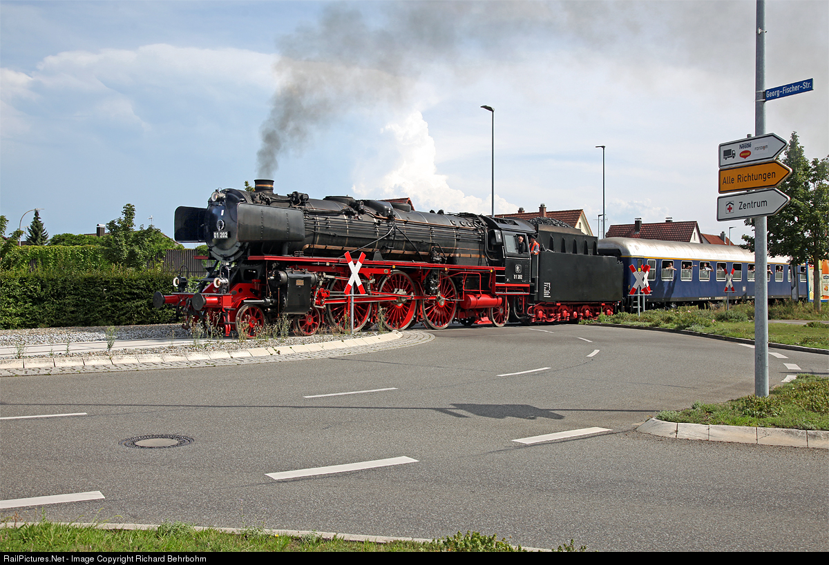 | 01 202 is crossing the "Volksbank" traffic roundabout in Singen. Freight trains were running here until 1996. After the line was closed, the rails were removed. In 2019 new rails were laid for reopening this year. |