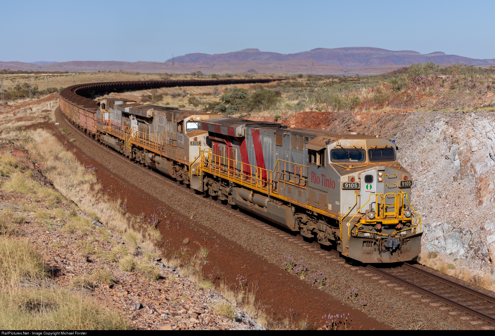 A loaded iron ore train coming up from Paraburdoo with a ES44ACi, ES44DCi, C44-9W combo and approximately 235 wagons heads north. Rio Tinto tends to fluxuate traffic between different mine sites, so it can be 'luck of the draw' in terms of seeing trains on the Tom Price - Paraburdoo line.