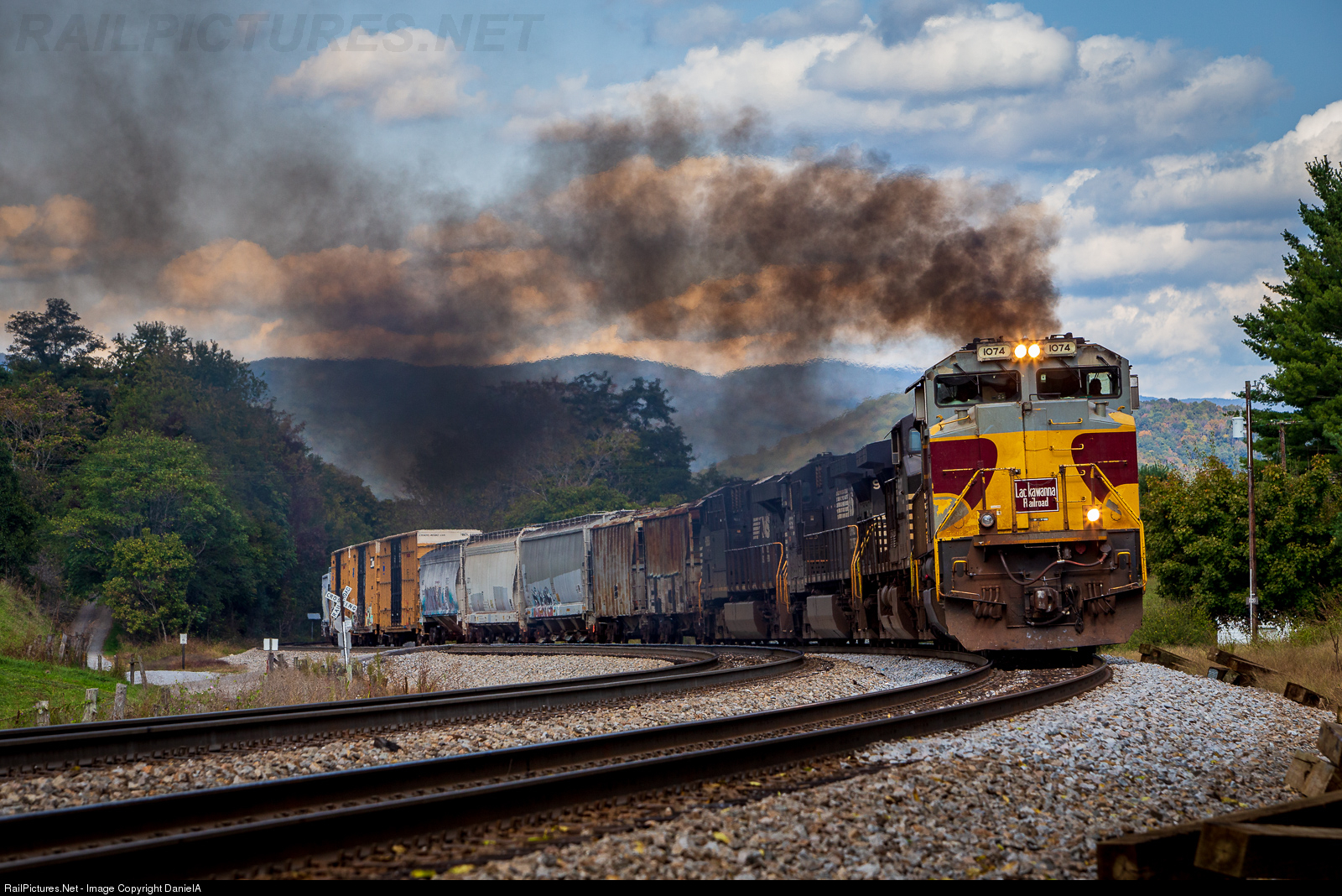 The Lackawanna heritage unit puts on a smoke show as it leads NS 15T up grade in Shawsville, Va.