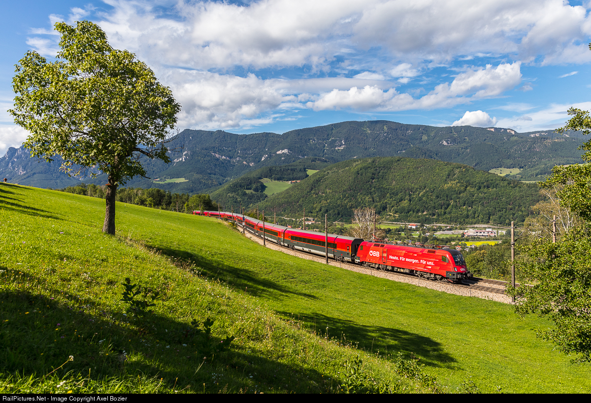 | Electric locomotive 1116 Series "Taurus" #225-4 in the publicity scheme "ÖBB Heute. Für morgen. Für uns." (Today. For tomorrow. For us.) with a RailJet consist begins the climb on the UNESCO World Heritage listed Semmering railway. |