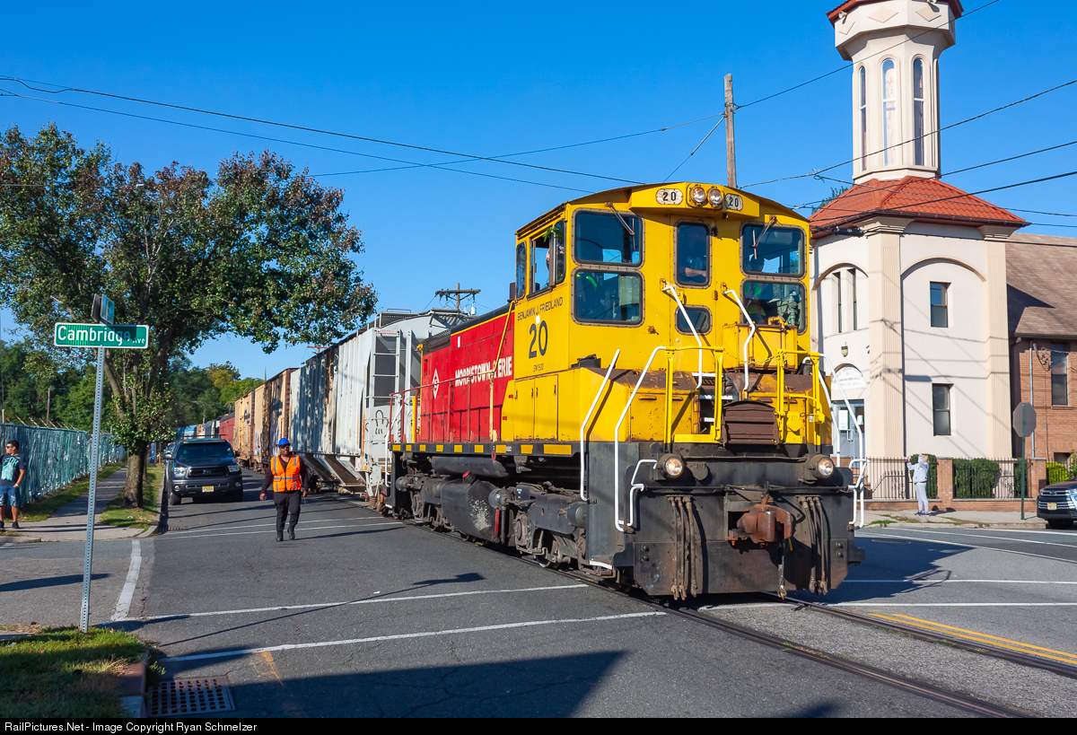 | Morristown & Erie 20 leads a long string of cars that once belonged to the New York & Greenwood Lake Railway along Monroe St. in Garfield. With the railroad defunct and the tracks being removed, the cars are being temporarily moved to Honesdale, PA on the Stourbridge Line with some eventually moving to a future museum in Port Jervis, NY and to other owners. |