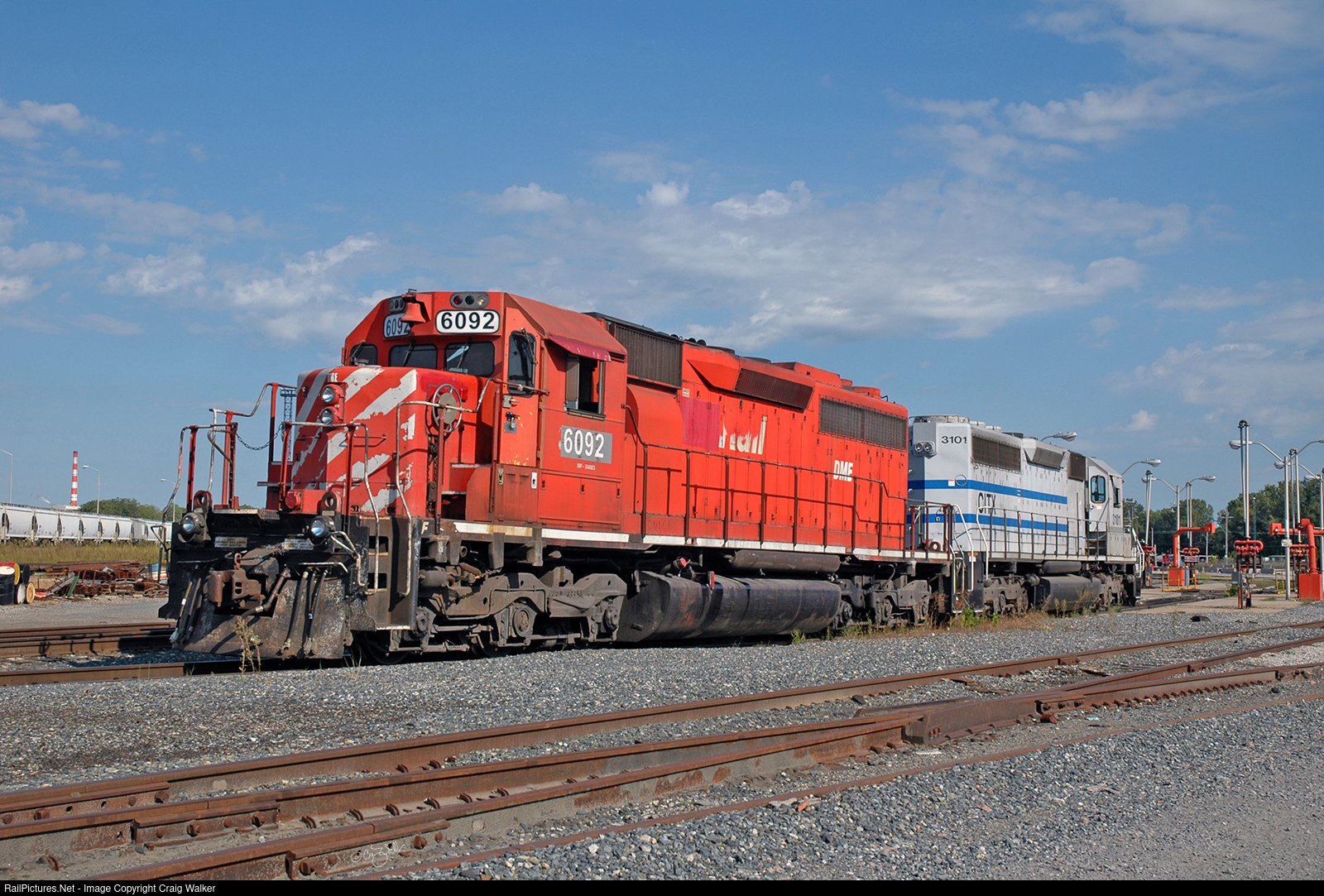 Tucked away in the KCS-MILW Joint Agency Yard (more commonly known as Knoche Yard, shared by Kansas City Southern and Canadian Pacific) is a pair of SD40s: Dakota Minnesota & Eastern 6092 is the former CP Rail 5528, and CITX 3101 is ex-Southern Pacific 8439 (later SP 7381, then GCFX 3101). The DM&E unit still has tell-tale signs of its Canadian heritage, paint notwithstanding, such as the tri-colour (it is Canadian, after all) classification lights, the numberboard-mounted bell, the nose light, heavy pilot and stepwells that allow a switchman to comfortably ride on the engine (because, after all, Canadians are just so darn polite!). As seen from the rear, the Citi Leasing unit betrays its SP heritage with the wide plate above the rear headlight, on which the SP placed a dual-bulb Gyralight and red single-bulb unintended emergency Gyralight above that. (Kansas City, Missouri – September 17, 2010) Photographed on railroad property with permission and full PPE.