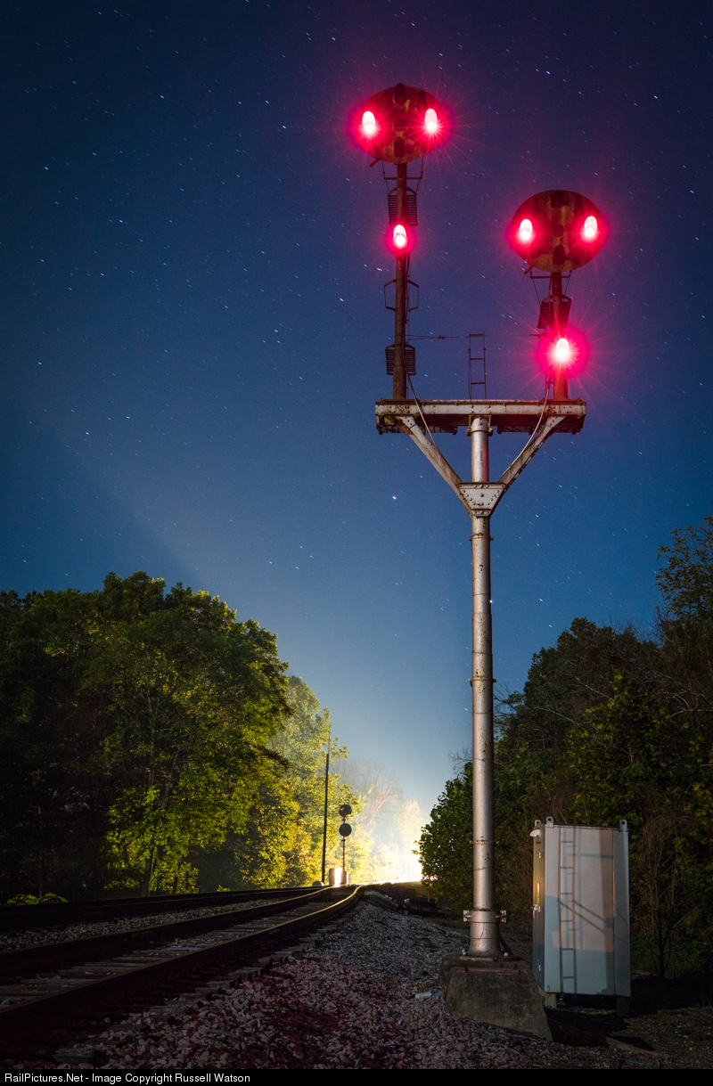 The headlights of NS train 16T pierce through the night sky while it idles short of the signal at Glasgow waiting for the southbound NS train 201 to take the siding.