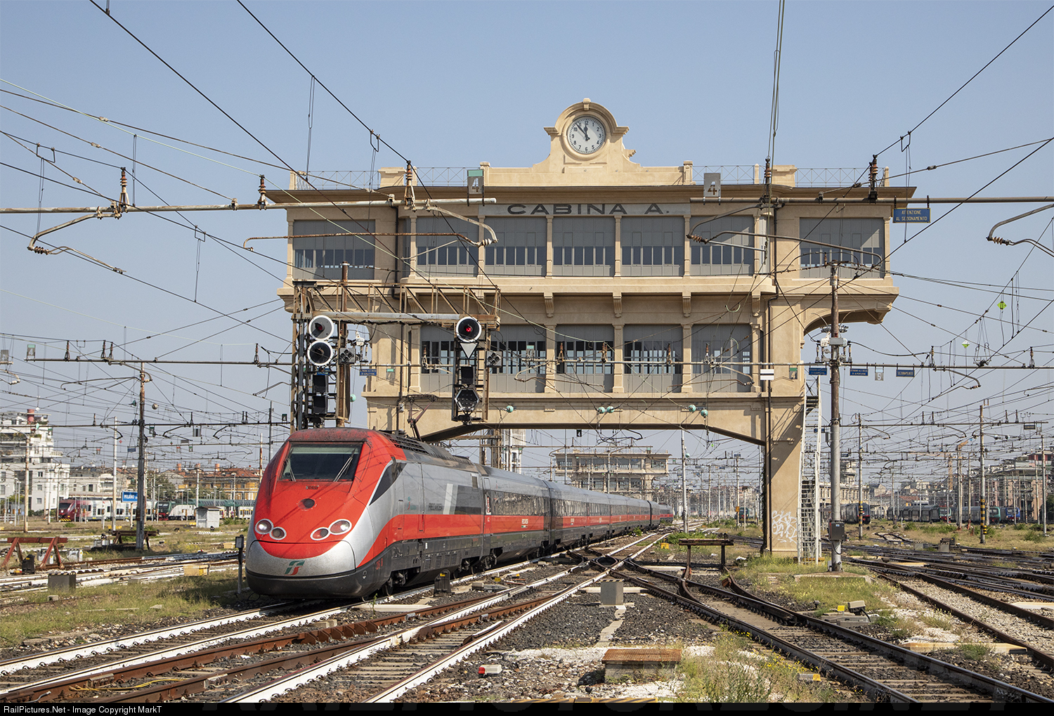 The (now redundant) Cabina A locking tower still oversees the modern high speed trains pulling into Milan's Central station. In the background Cabina C can also be seen, which implies there used to be a Cabina B too!