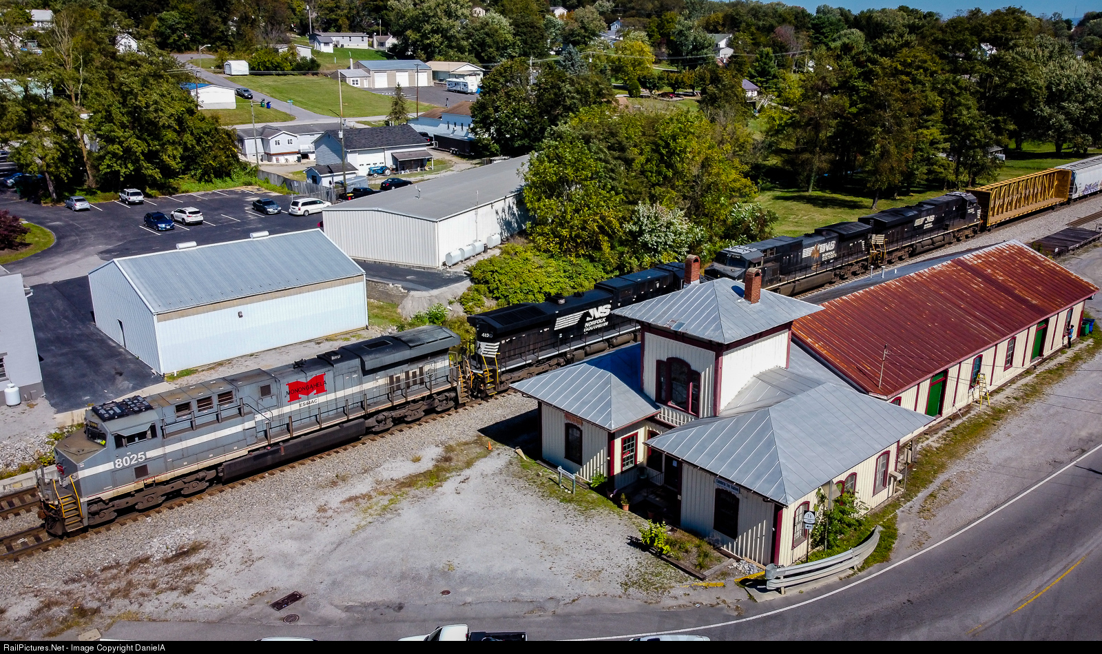 A drone photo of NS 15T passing by the ex-N&W depot in Christiansburg, Va with the Monongahela heritage unit in the lead.
