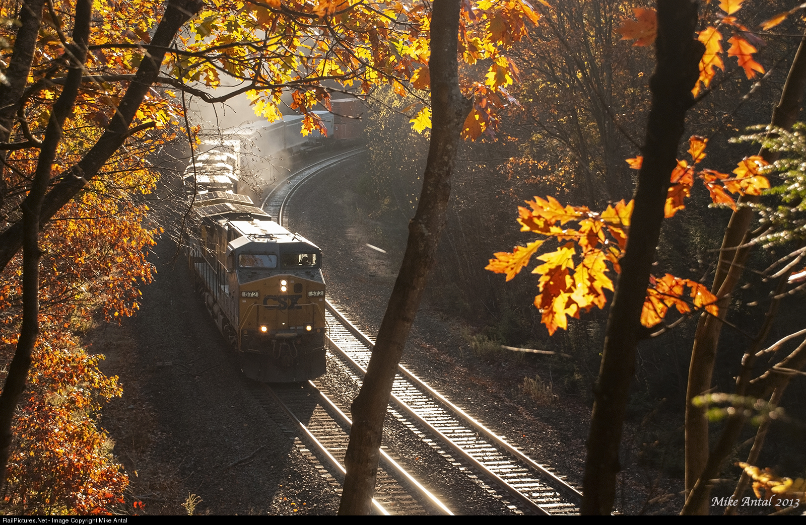 | The sun starts to warm a cold Autumn morning as the third and final westbound intermodal Q019 ascends the east flank of Washington Hill with ease, rounding the apex of the horseshoe curve at the "Art Colony" on the Chester/Middlefield town line. Fall is backlighting's best friend, and the Berkshire Hills of western Massachusetts certainly showcase it better than most. |