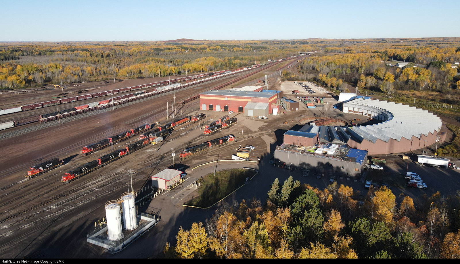 A birds eye view of the Proctor shop and round house along with peak fall colors in Proctor Minnesota.