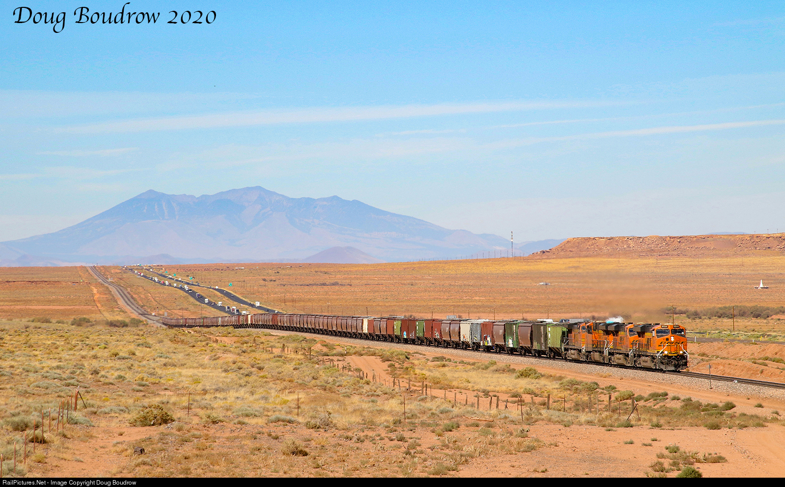 | An Eastbound unit grain train is seen arriving in Winslow. Some 60 miles to the West the 12,633 foot San Francisco Mountain looms over the desert. The peaks are partially obscured by a residual haze from ongoing wildfires in California. |