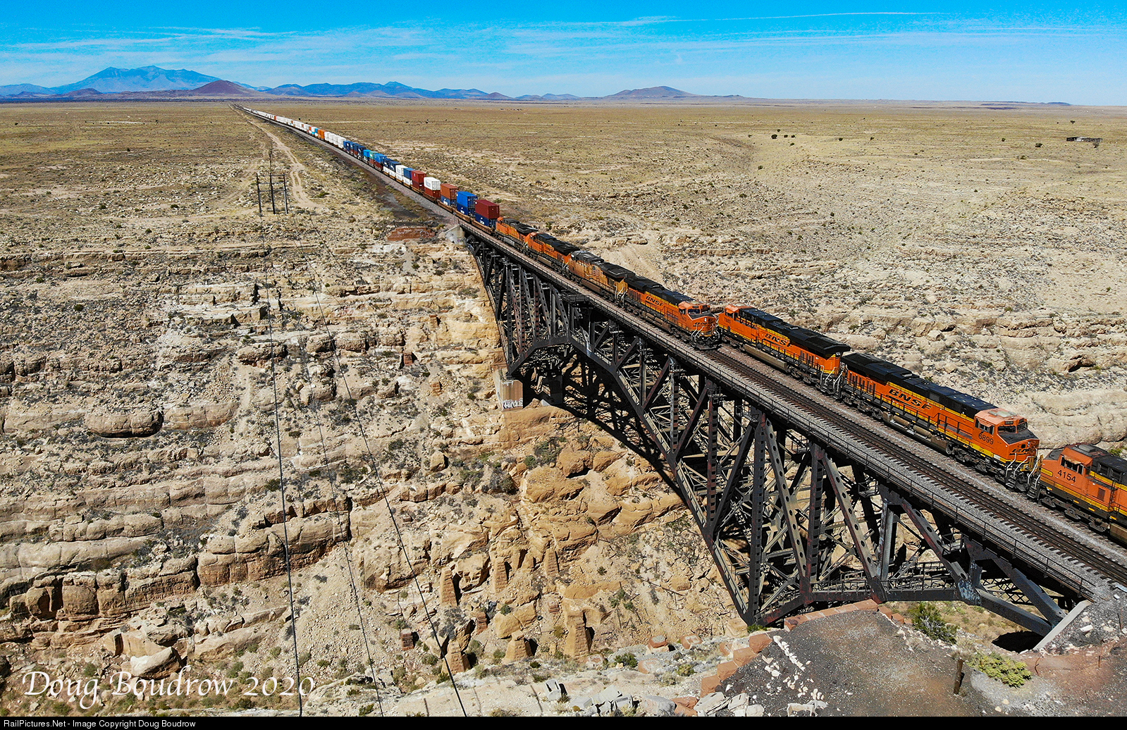 An Eastbound hotshot intermodal train is seen barreling across the Arizona desert crossing the 544-foot bridge at Canyon Diablo. A Westbound is seen meeting the train on the bridge as if it was perfectly timed.